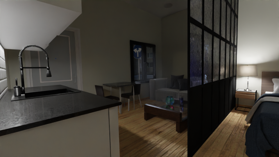 Es rayo de luz de luna o sol que entra por la ventana, que ilumina a las partículas que están flotando en el aire, muy característico de la bruma a primera hora, las gotas de humedad flotando en un bosque y el sol que se filtra por las ramas de los arboles, en los renders se llama luz volumétrica, se puede copiar el efecto en el renderizado, me encanta como queda.