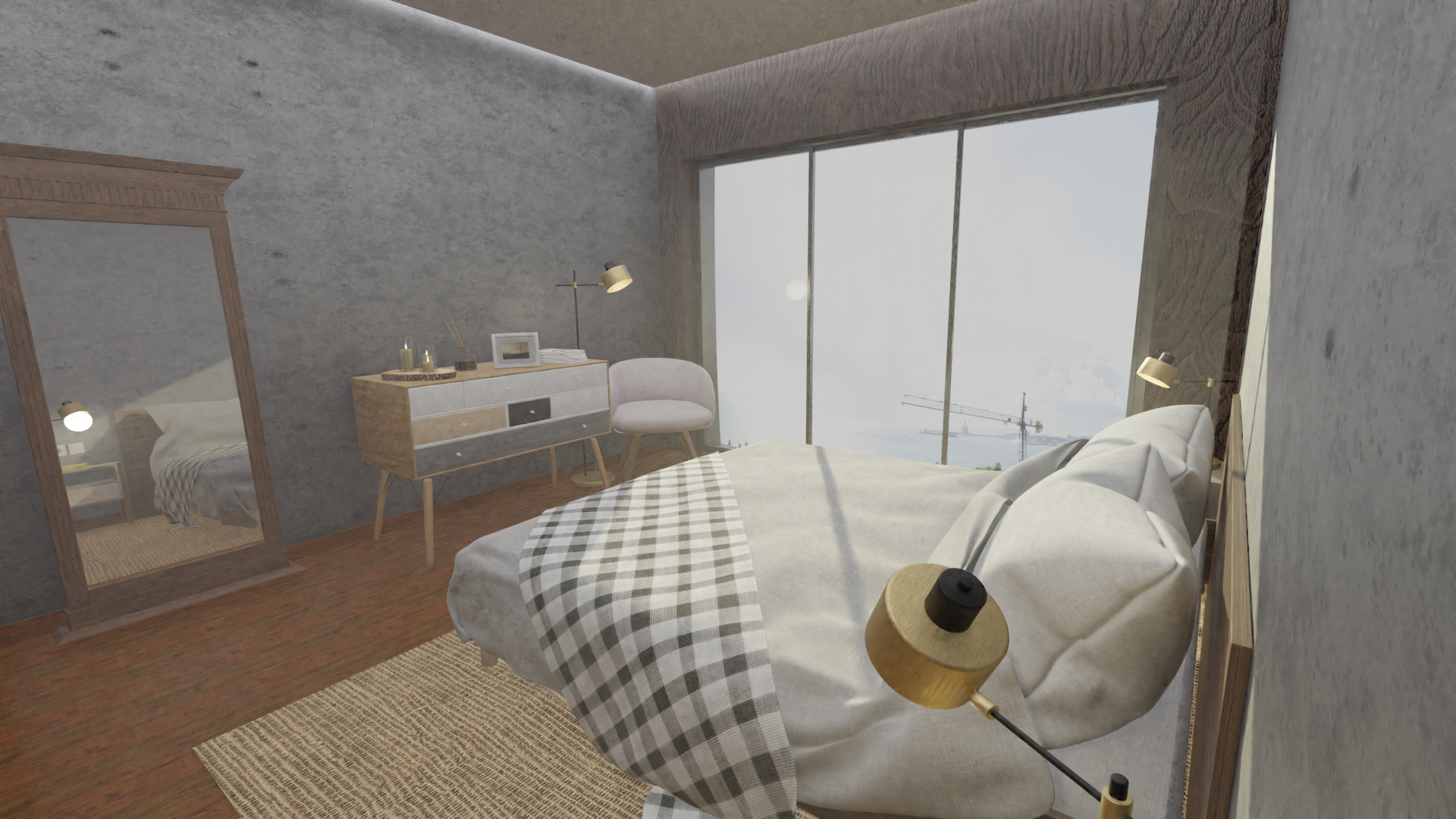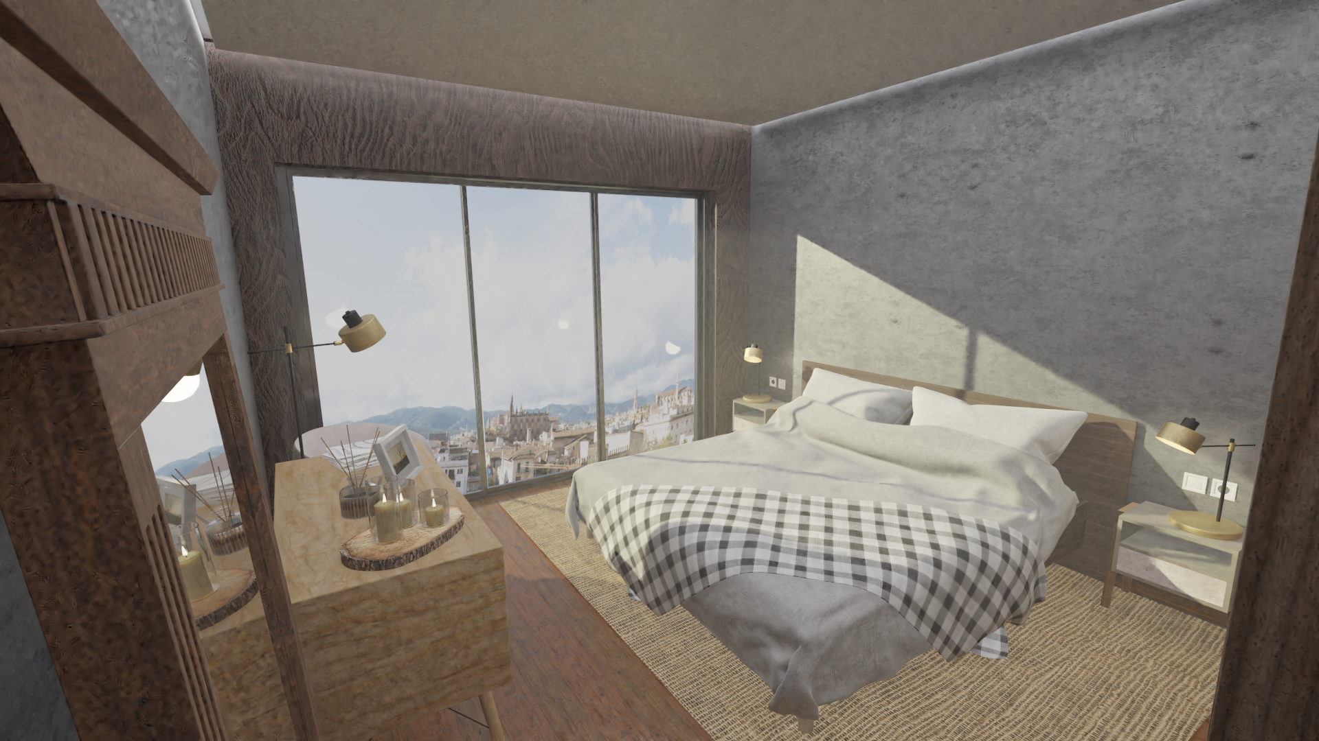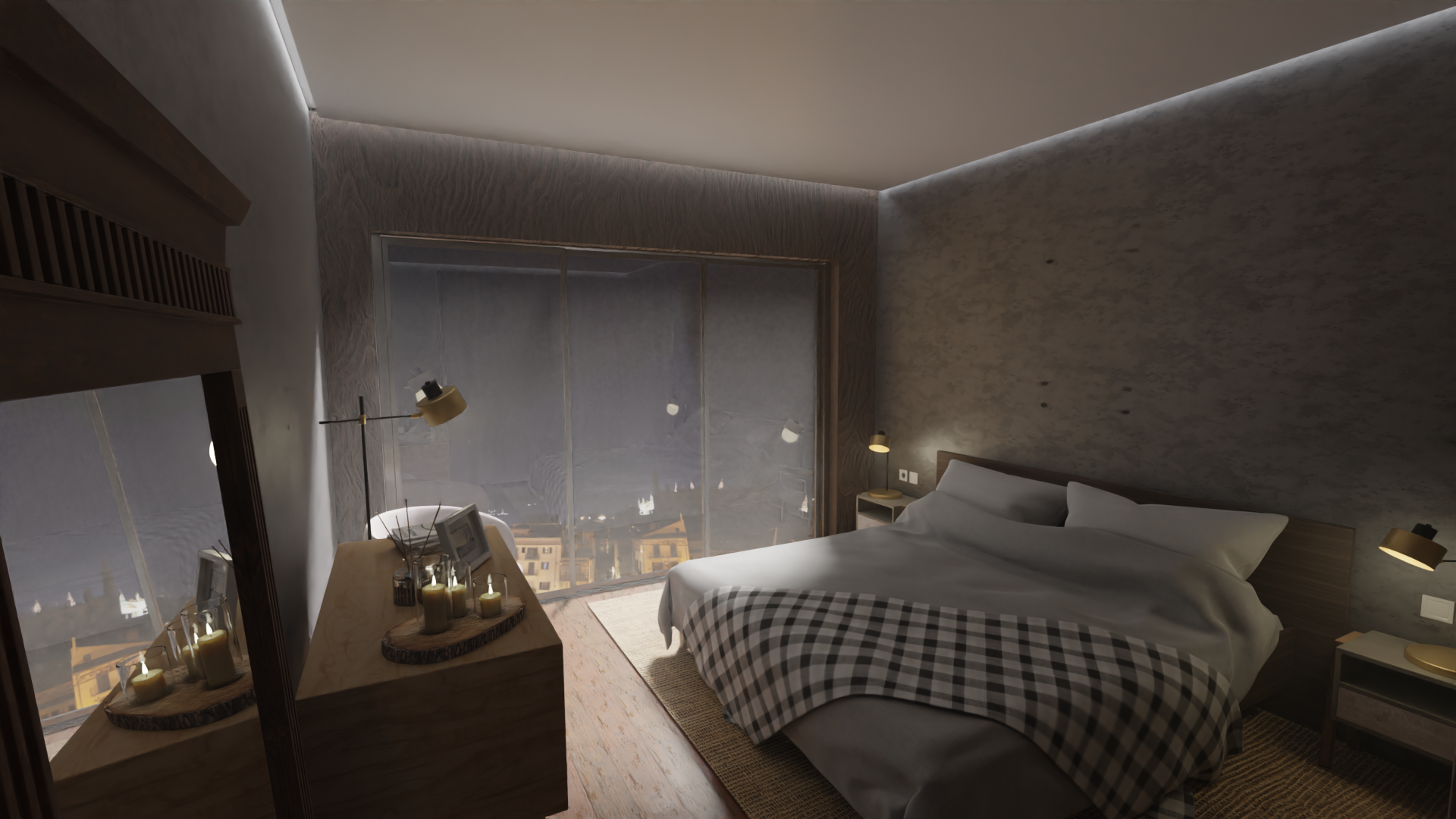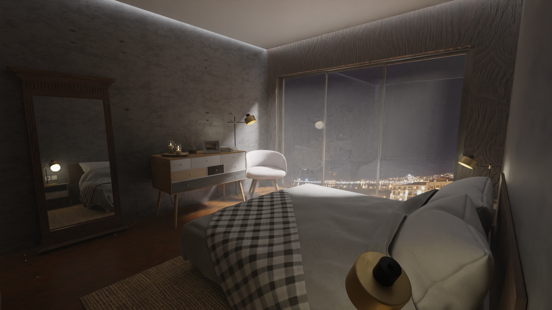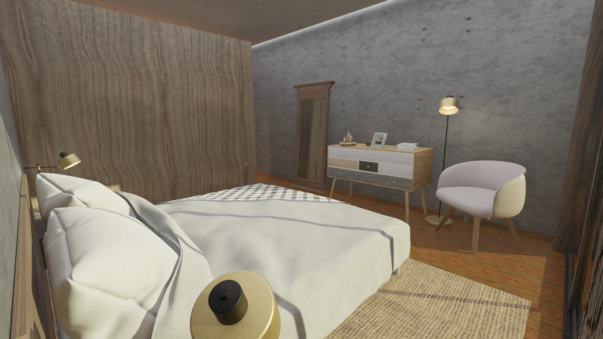 Tomas de día y noche, tiempo de realización incluida renderización solo de imágenes 48hs, valor 250€+IVA, todos los materiales, selección de modelos en biblioteca, fotos de fondo, plano de planta y detalles provistos por el cliente. Dada la agilidad que genera esta selección por parte del cliente, y el detalle de el plano de planta, se evita mucho tiempo de selección, retoques del resultado, achicando costos de ejecución.